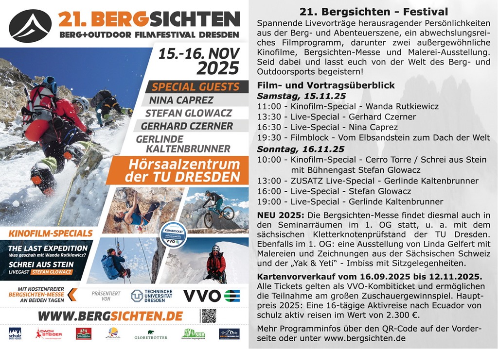 Auch in diesem Jahr gibt es wieder das traditionelle Bergsichten-Festival im Hörsaalzentrum der TU-Dresden. Und auch in diesem Jahr sind die IG Stiegen- und Wanderfreunde sowie die BI Naturpark Sächsische Schweiz mit einem gemeinsamen Stand vertreten. Dort wird es wohl wie in allen Jahren zuvor hauptsächlich erbauliche, manchmal kritische, Gespräche geben. Daneben aber auch so allerlei Kleinkram wie den IG-Stiegen-Kalender, historische Wanderkarten oder Bierdeckel von Rolf Böhm. Und als kleines Geschenk zum bevorstehenden Feste auch noch eine weihnachtliche Postkarte.